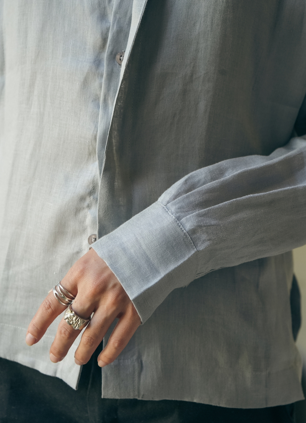 La camisa anima de 100% lino con su silueta recta, cartera escondida, pinzas de entalle en la espalda y tablones remite a una camisa clásica de trabajo, esas prendas que hablan de eficiencia, disciplina y determinación pero con un giro que la hace más especial. La rectitud de la camisa refleja esa firmeza en la aceptación de lo que ha sido, lo que es y lo que vendrá, siempre con una postura erguida frente al destino. La estructura recta de la camisa no limita su movimiento, sino que la convierte en una prenda de poder silencioso, un recordatorio de que la verdadera fuerza no siempre necesita ser visible, pero siempre está lista para ser desplegada cuando la mujer lo decida. En su interior cuenta con costuras francesas para asegurar la prolijidad de la prenda.